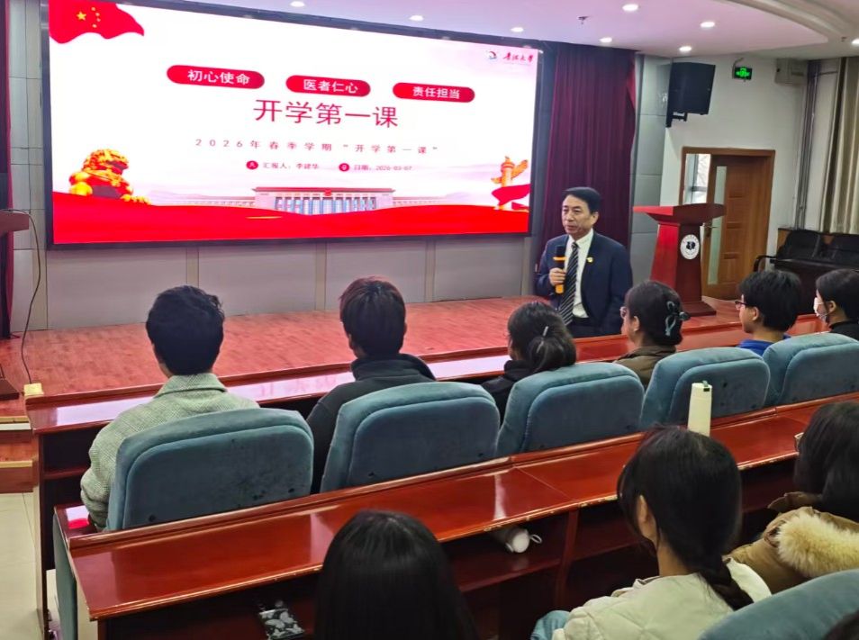 3月7日下午,医学院党委副书记、副院长李建华面向各院系学生代表讲授新学期“开学第一课”。此次讲座以初心使命、医者仁心、责任担当为主题,200余名学生代表齐聚一堂,共上思想引领“第一课”。