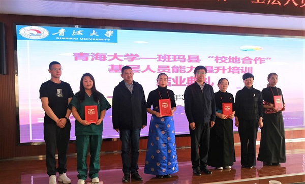 校党委常委副校长任延明进行了讲话,他代表青海大学对各位培训老师的辛苦付出,表示衷心的感谢;对各位学员的顺利结业,表示热烈的祝贺。他指出,此次培训是青海大学与地方政府校地合作,协同发展的重要举措;是提升基层医疗机构业务能力,实现我省医疗机构高质量发展的有效路径;也是发挥青海大学“姓青名海”,服务地方的职能体现和责任担当。更是青海大学与班玛县深厚友情的延续。他强调,青海大学和班玛县牵手联动,共同组织举办培训班,是赓续青海大学为地方政府在优秀医疗卫生人才培养、基层卫生人员继续教育和服务区域卫生事业能力提升的责任。在这一个月的培训中,医学部本着“以投入为前提、以质量为核心、以规范为准绳”的培训宗旨,教学管理部精心组织,临床医学院高度负责,选拔临床经验丰富、教学能力突出的老师组成师资团队。老师们课件内容详细,重点突出,授课贴近基层;学员们勤学好问、积极上进、刻苦认真;通过系列规范、严谨的培训,各位学员不负众望,圆满完成了此次培训任务。他希望,各位学员能在自己的工作岗位上继续发扬新青海精神,以热情饱满的干劲,服务好每一位患者,守护好每一位群众的健康;希望以刻苦钻研、孜孜不倦、精益求精的执业精神,为青藏高原的医药卫生事业发展和广大牧区群众的健康奋斗终生。